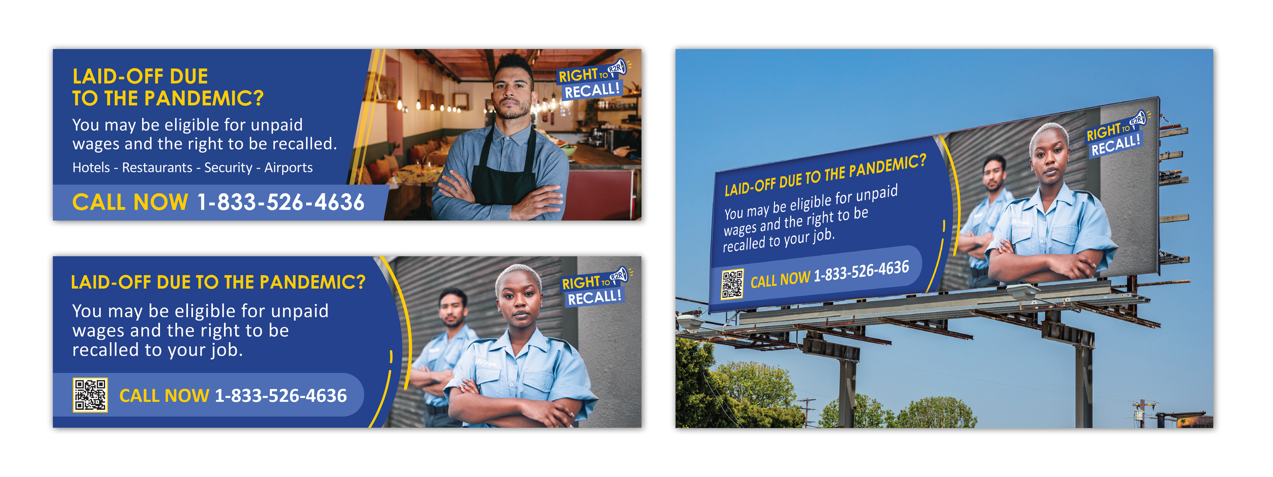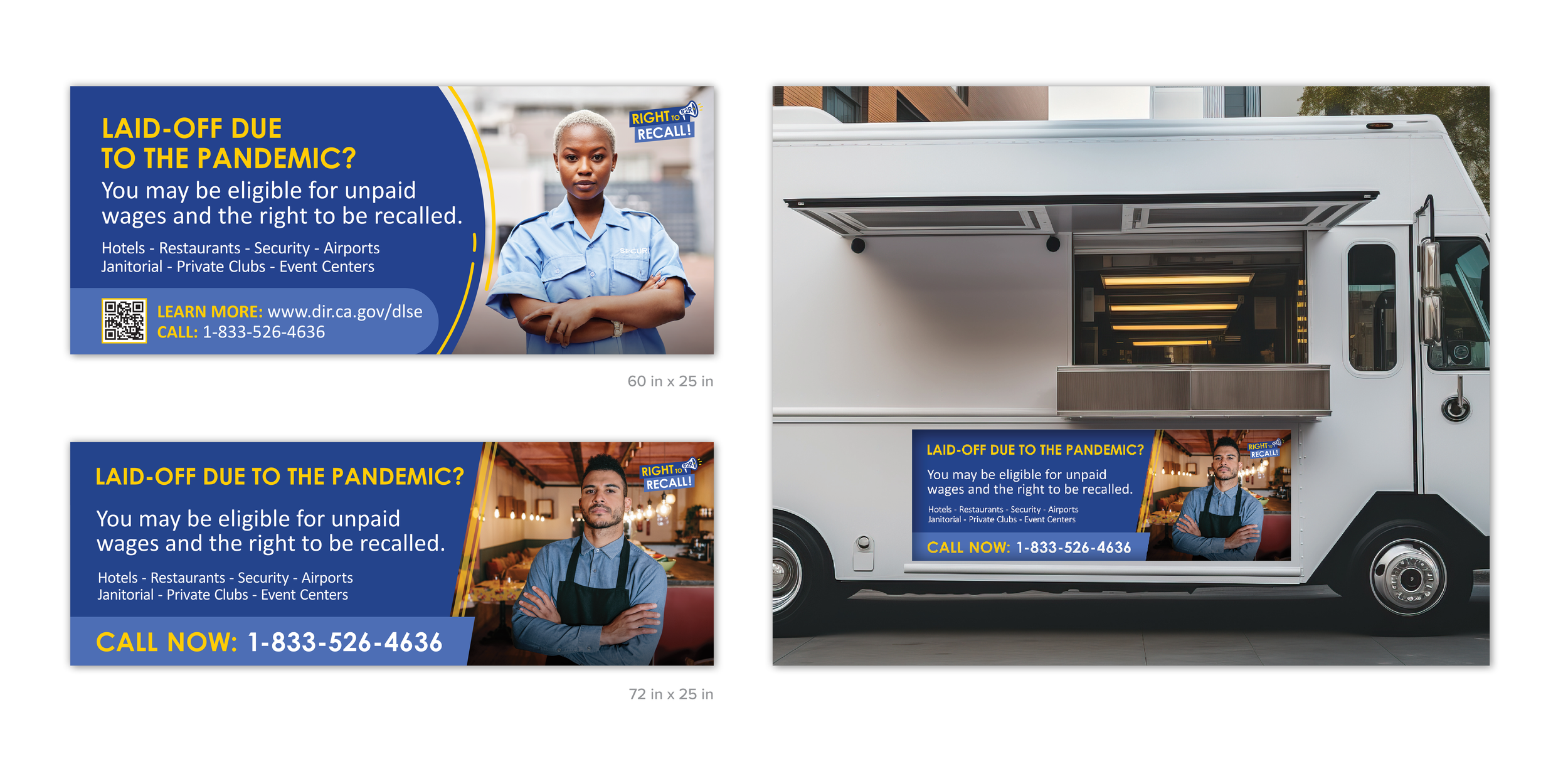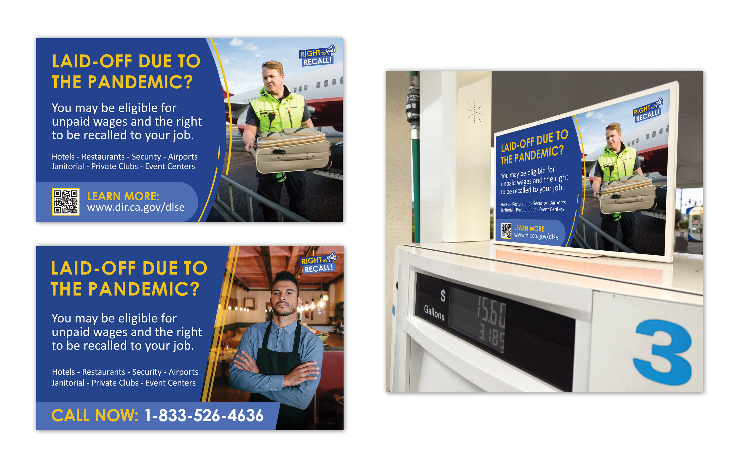 The Right to Recall law was originally established in Senate Bill 93 (SB93) in 2021, and then extended by Senate Bill 723 (SB723) in 2023. The Right to Recall law (Labor Code 2810.8) provides rehiring rights for employees in hospitality and building services who were laid off due to COVID-19-related reasons. When positions become available, employers must offer them to qualified laid-off employees based on seniority. I had the opportunity to create a logo, branding and materials. A restriction was to keep the campaign color the same as the Department of Industrial Relations' brand color.
