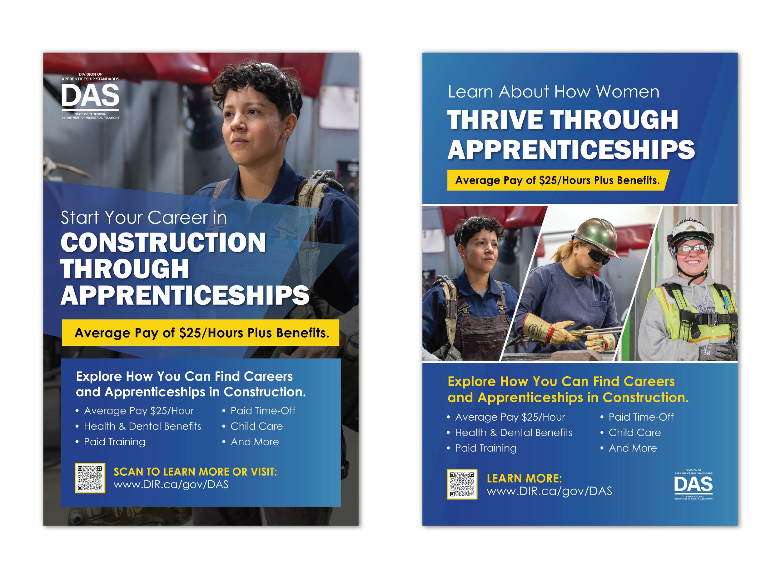 The California Department of Industrial Relations (DIR) created a program to help more women get into trade jobs. Only 4 out of every 100 construction workers in California are women. DIR gave $26 million to 25 programs to train women for jobs like carpentry, plumbing, and electrical work. These programs also provide childcare, apprenticeships, and women safety resources. I had the opportunity to create a campaign branding and materials promoting women and non-binary individuals to apply for trade apprenticeships or jobs. Images are real women working in trade.